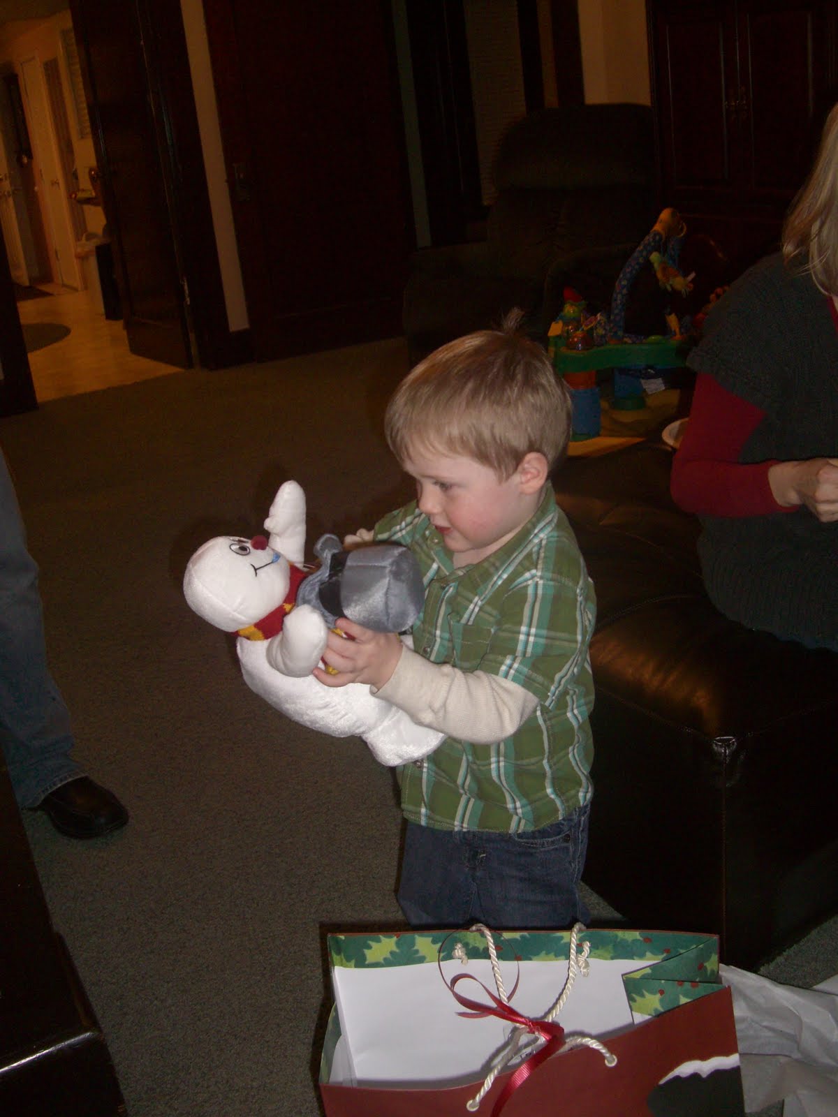 We enjoyed a delicious turkey/ham dinner with all the fixings (and dessert) at Jeff's sister, Haley's home. Her husband was the masterful chef. Afterward Jeff's mom and step-dad gifted us with their presents. Ironically, Quinton has been SMITTEN with Frosty the Snowman (the classic cartoon) this year and Grandma TeeTee gave him a singing Frosty! He loved it...and even slept with it that night!
